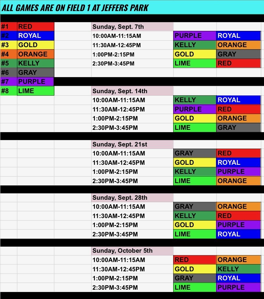 Game schedules are set in mid-March at the coach's meeting and will begin in May and go through mid-June. Games will typically be scheduled for Monday, Tuesday, Wednesday, and Thursday evenings, with exceptions being make-up games, etc. Typically teams will play between 10-15 games.
