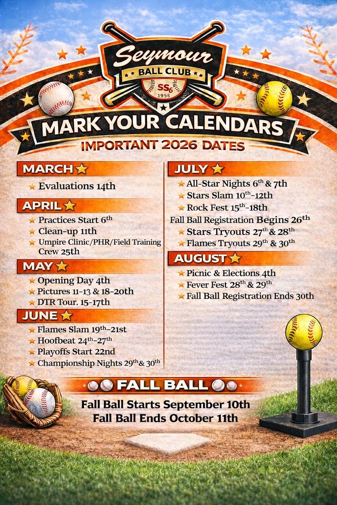 It’s going to be an exciting year for our club! Make sure to save these important dates so you don’t miss out on all that is going on at Seymour Ball Club!