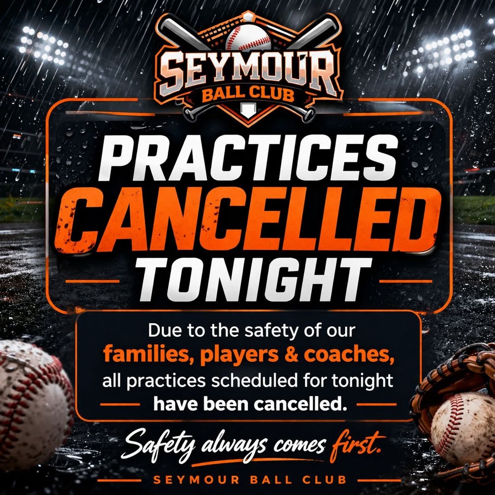 All practices at Seymour fields are canceled for tonight, Monday, April 13th due to the threat of inclement weather. The safety of our players and families is very important to us. We hope to see practices up and running the rest of this week. Thank you!